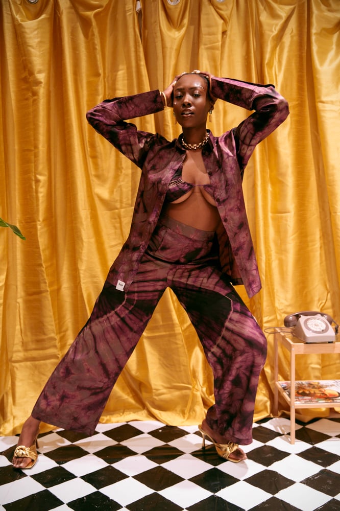 This set contains two pieces, including; a shirt and wide leg trousers - the bra is not included